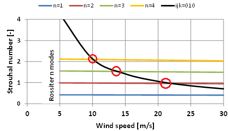 From this example and in the cavity depth direction, there are 3 frequencies (highlighted by red circles) that are close to the natural frequencies of the cavity. These frequencies occur at three different wind speeds.