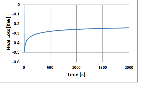 The total losses for this example are predicted to be around 0.25 KW once the simulation has reached a steady state solution. All these losses are due to the heat by conduction through the wall.