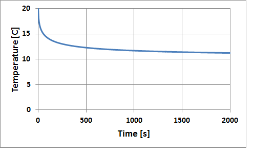 The transient temperature is predicted at a sensor located at the middle of the wall. After 1500 [s], the solution converges towards a steady solution with a value of about 11.2 o C.