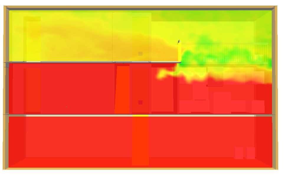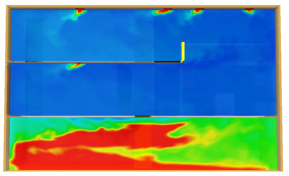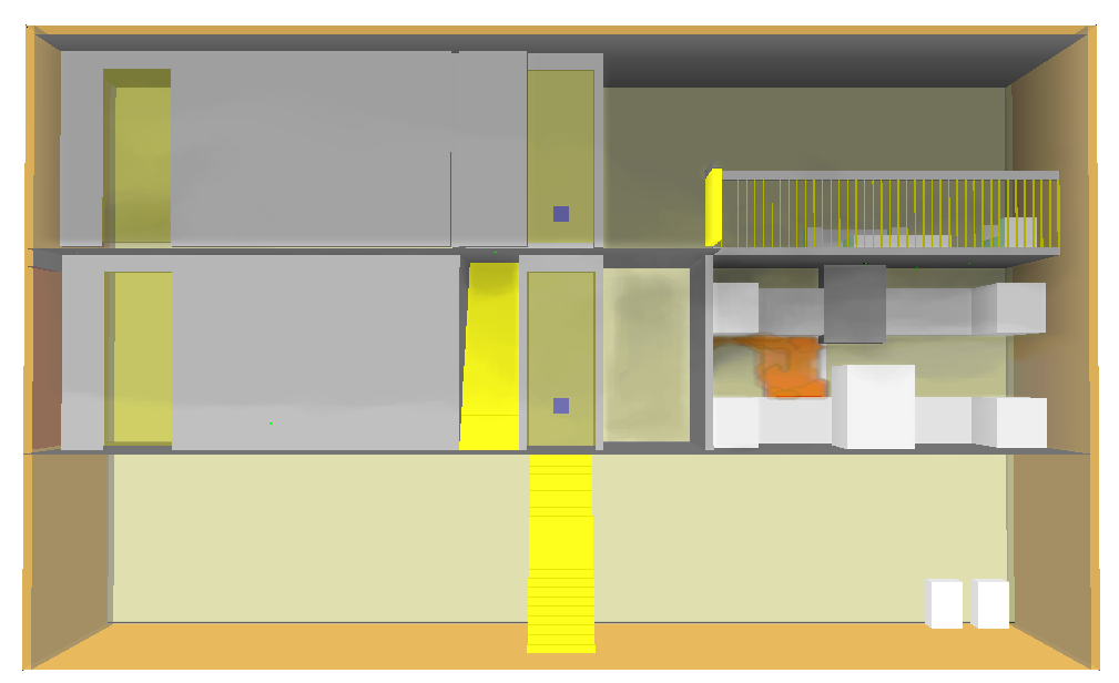 For the images and animations below, a fire scenario was analysed occurring in a typical 2 storey open concept house. The main objective of these simulations is to determine where to place a blower which will be automatically activated once the smoke visibility has reached a threshold to exhaust the smoke outside the house and allow the evacuation of people with less life threatening conditions due to the smoke inhalation.