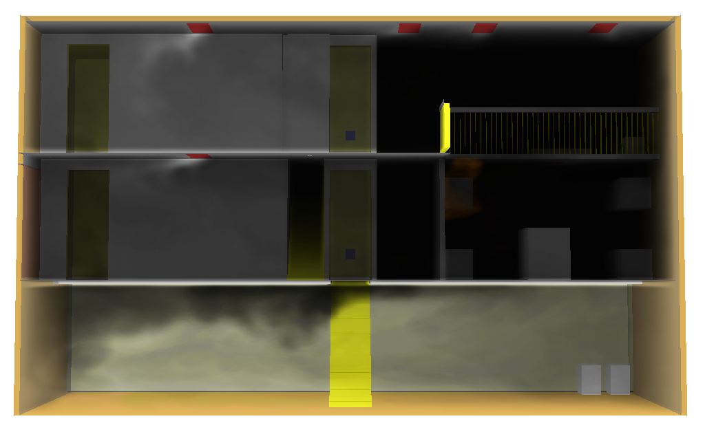 Smoke density blocking the path towards the main exit | Soot Visibility (blue color corresponds to low visibility) |