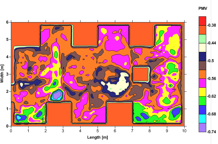 At EASTechnology, we developed a method to predict the PMV and PPD inside a building based on CFD results of velocity and temperature. The PMV and PPD can be predicted in the entire computational domain or at selected zones. Then, a volume integral can be performed to estimate the PMV and PPD for the entire space. Statistical values of PMV and PPD such as minimum, maximum and standard deviation can also be provided.