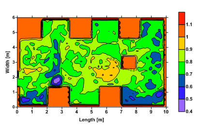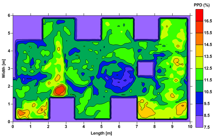 Similarly to the thermal comfort, we developed a method to estimate the ADPI distribution in the space using the CFD results. Then, a volume integral is performed to calculate the average value of the ADPI within the space. A value of ADPI close to the unity means good air ventilation. This method is illustrated in the figures below using the clean lab example for which the PMV and PPD were calculated.