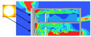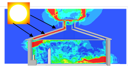 HOME <Building Solutions < <Natural Ventilation CFD assessment < Solar-Induced VentilationThe sun is used to heat one or more sides of the building (solar wall, solar chimney, solar roof). This is mainly buoyancy driven ventilation and is much efficient in hot climate regions