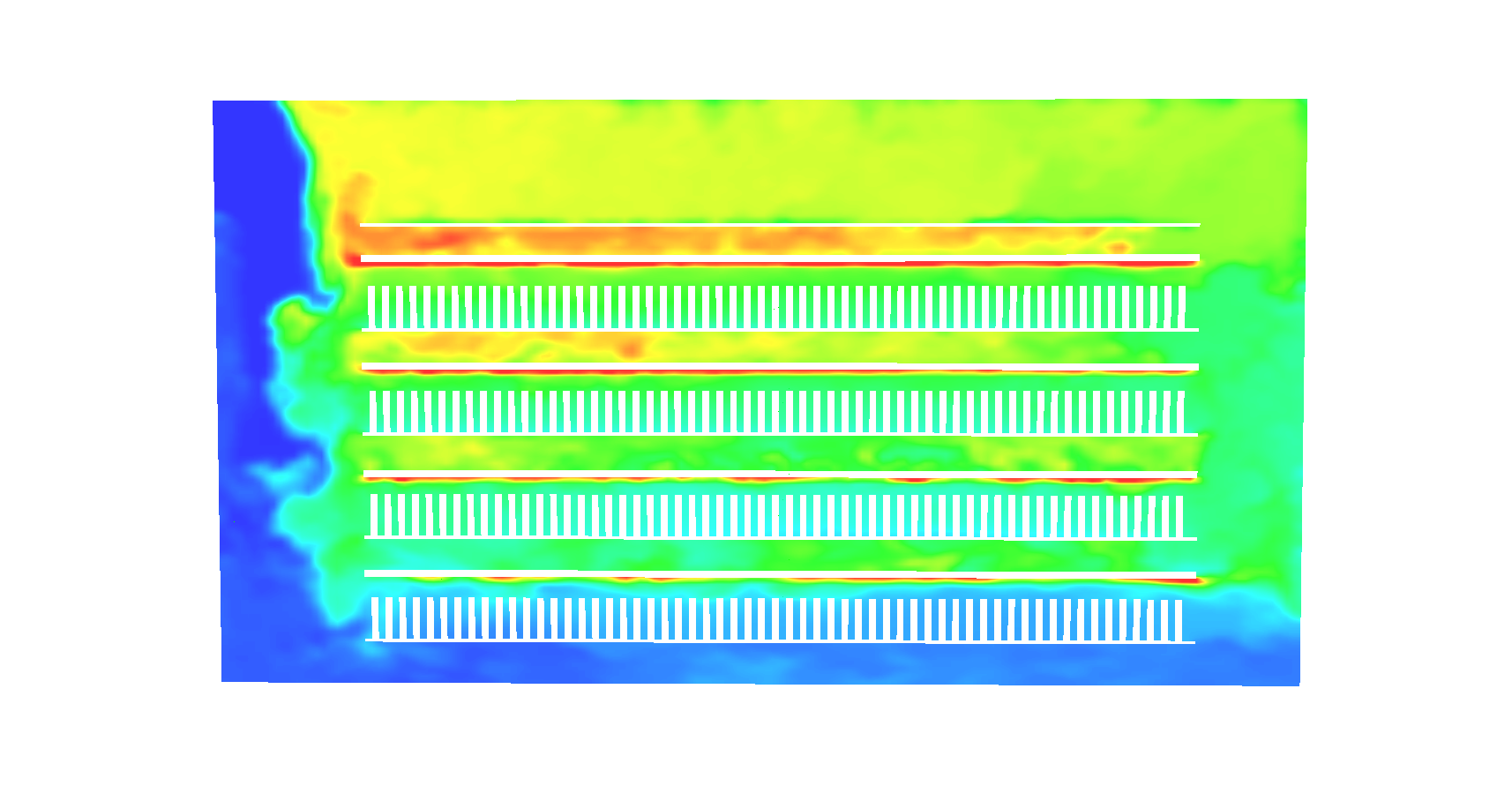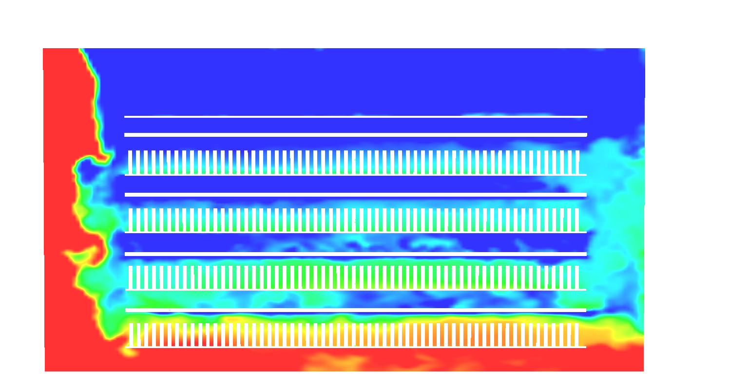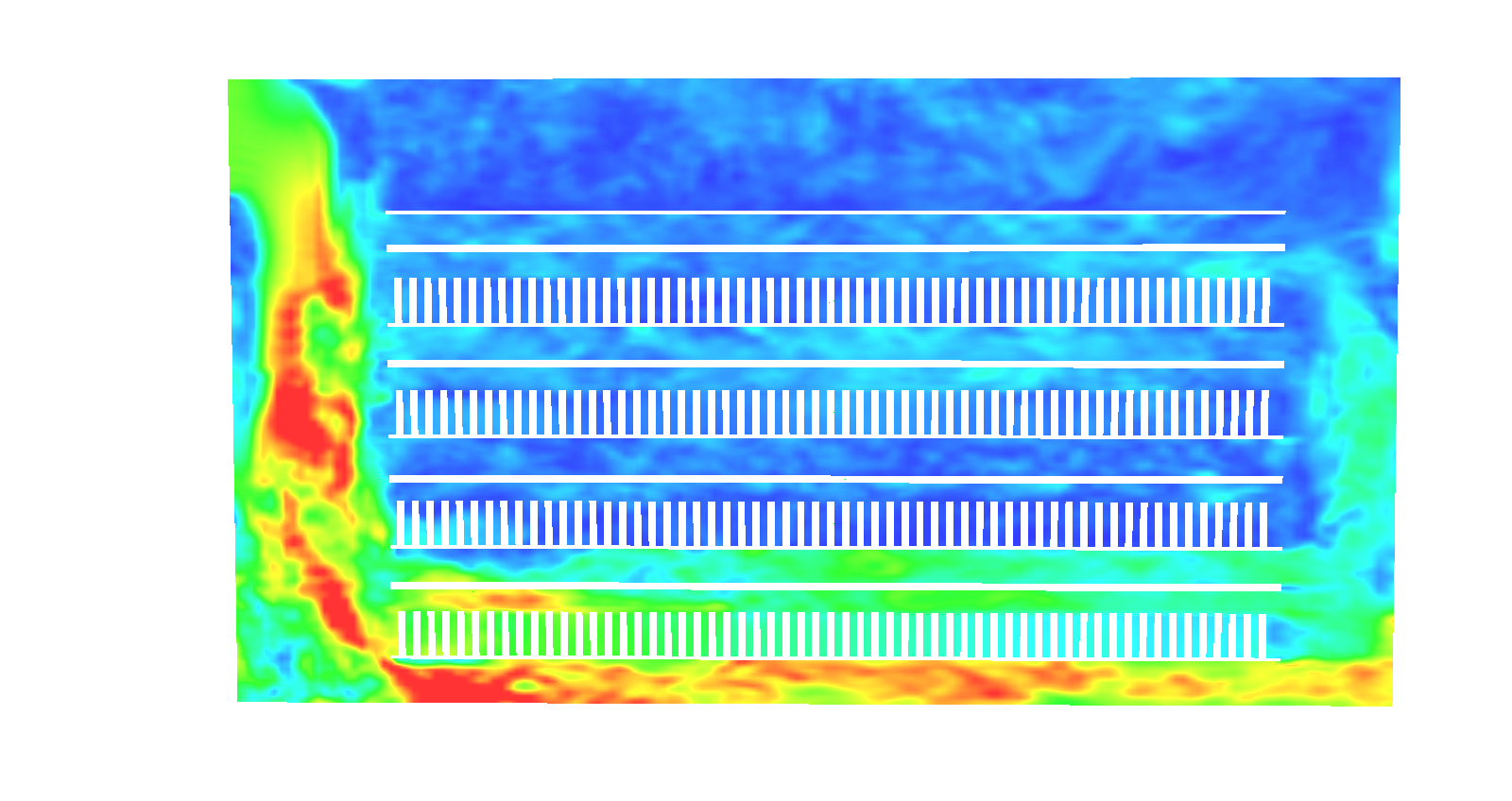 In the figures below, CFD modeling was performed to analysis the climate inside a multi layers flowering room (Fig1a). Figure 1b shows the air distribution across the plant canopy. The cold jet air emanating from the top supply diffuser impacts the first rows of plants and moves downward towards the floor creating a sort of air curtains in front of the first rows, particularly at the highest layers. The cool air moves at the bottom of the floor towards the return grilles located near the floor at the opposite wall. This air movement has induced a non uniform vertical distribution of the temperature (Fig1c) where the two bottom layers are cool enough while the top two layers remain relatively hot. Consequently, this hot air has noticeably reduced the relative humidity at the higher layers (Fig1d). In conclusion, this proposed design will have a negative impact on the plant growth and the estimated yield.